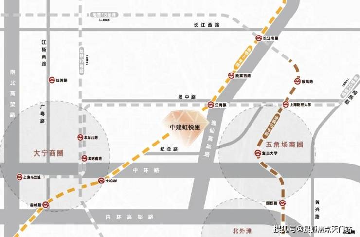 商业方面:江湾镇这个板块是宝山/静安/虹口/杨浦四区交界处,板块“左邻右舍”都是比较热闹的商圈——西面市北高新+协信、北面高境+宝山万达、东面杨浦五角场,南面虹口曲阳+四川北路商圈。