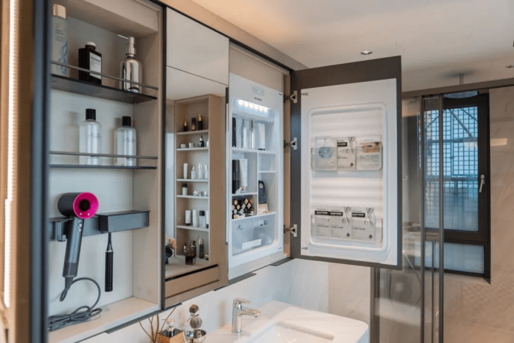 卫生间的镜柜设计,内设三宫格镜柜收纳:左侧是日常洗漱用品,中间作为护肤常备收纳,右侧是美妆冰箱收纳。