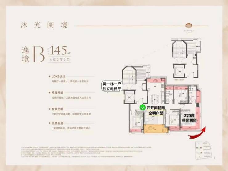 这个户型全部是类一梯一户独立电梯厅设计。四开间朝南+南北通透+全明户型+270度大飘窗,改善户型的终极之作!无论是四口之家还是三代同堂,尺度都能完全容纳。