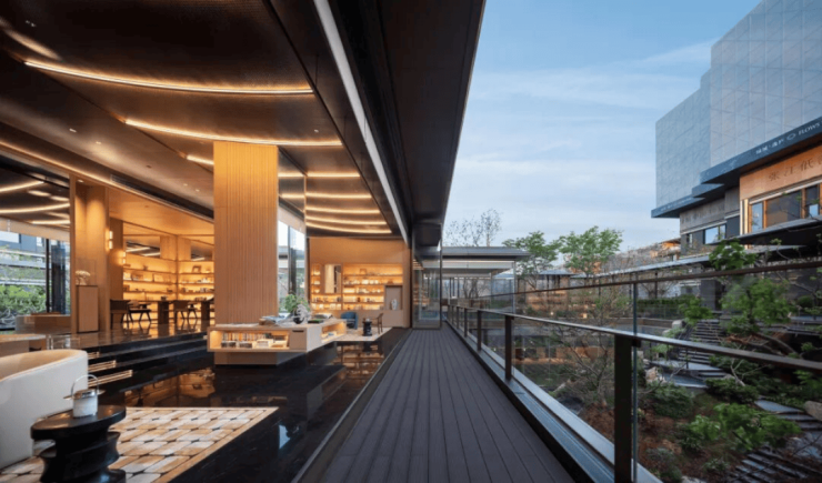 其中最令我惊喜的是这个占据社区最佳观景位的"悬亭茶室"。这是一个悬浮式的空间,一方面可俯瞰整个下沉庭院,景色绝美;另一方面,与亲朋好友在此品名洽谈聚会时,颇有“高山流水觅知音”的东方意境。