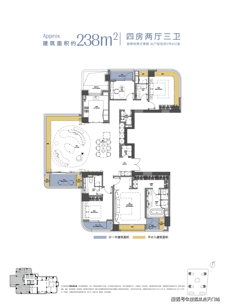 比如这个建面约238㎡户型,采用环幕设计,将徐汇滨江城市景观、下沉庭院等自然与人文景观尽收眼底,营造沉浸式居住体验。