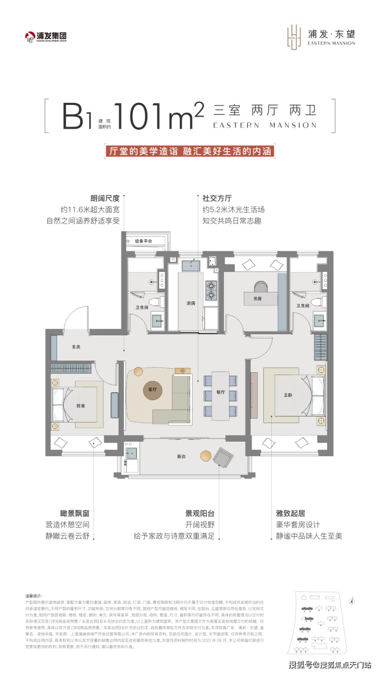 建面约101㎡B1户型尺度感惊人,约5.2米南向面宽的客餐厅以及阳台,为室内带来了非常出色的采光度。