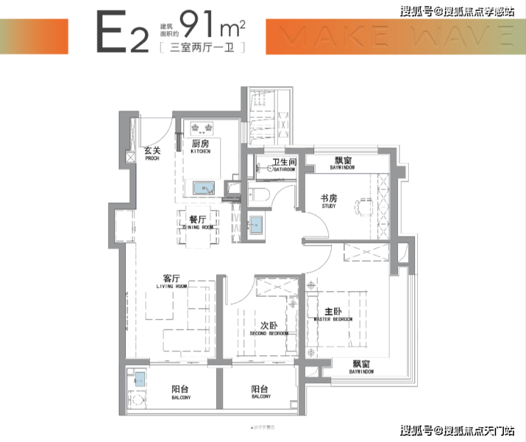 而招商·时代潮派|东屿此次建面约91㎡户型,就做出来了比市面百平户型更好的的 “南向双阳台+南北双飘窗”设计。