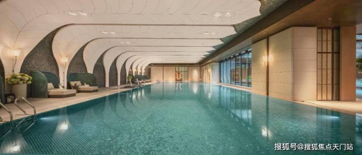 恒温泳池:第一,采用了景德镇烧制的陶瓷马赛克,独特的釉面色彩由景德镇老师傅手工浇筑而成,充满人文艺术底蕴;第二,羽毛天花造型,由600余件铝板打造,表面采用了仿贝壳纹的艺术漆处理,带来松弛度假感;第三,不仅配置了约25m×10m的4道泳池,还采用了奥运会同款空调除湿系统,彰显高档品质细节!