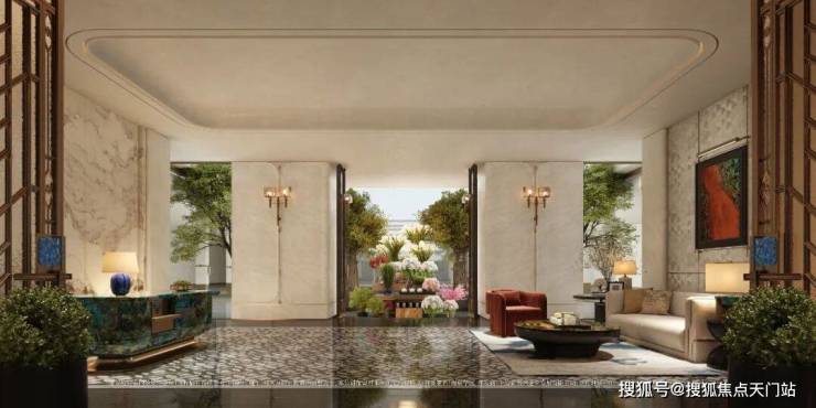 以玉兰门庭—迎归大堂—莳花荟为主轴,敬献步履生辉的归家艺旅:玉兰门庭如繁花盛绽,尊华瑞鳞水景聚运生财,双尊铜狮镇守家宅;迎归大堂流转光影艺韵,百羽栖澜艺术雕塑、芦海宸韵非遗绣作流淌摩登气韵;莳花荟中央会客厅移步异景,献映会客、休闲等雅会。