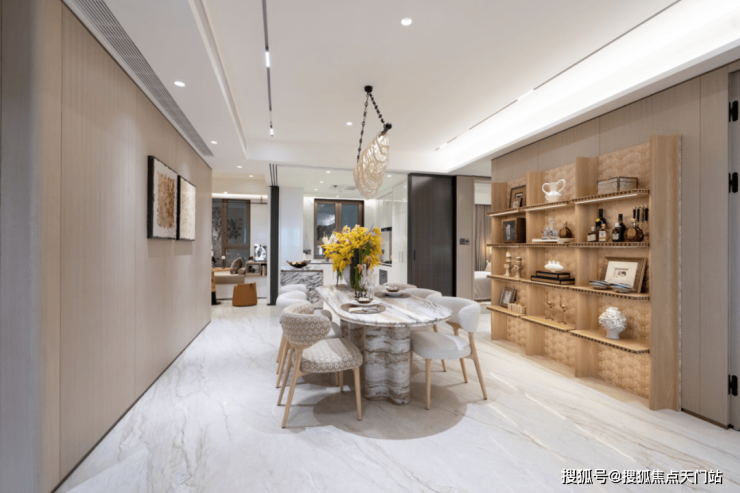 而前滩元境这次据悉:不仅各个空间近乎零涂料墙面,大面积采用壁布、木饰面与软装材质覆盖,更做到墙柜门一体化、隐形门一体化设计,高级感浑然一体。