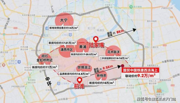 而以陆家嘴和前滩为中心画圈,周边8-9km半径中,大多都是均价约14万+、甚至不乏有均价约16-17万+的顶级豪宅新房。