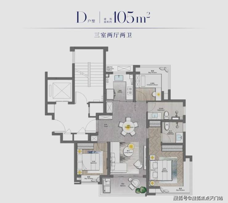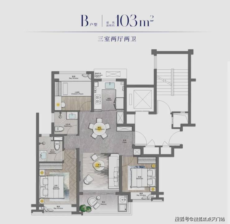 除此之外,边套的建面约105㎡3房户型还打造了南北卧室双约270度转角飘窗的设计,这个实际使用面积相当出众。