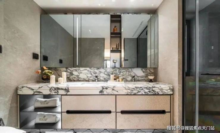 另外采用意大利 “大花白” 天然石材实现地墙满铺,双台盆与双镜柜的对称设计复刻五星酒店规制,美妆冰箱精准控温呵护护肤品,奢华至极!