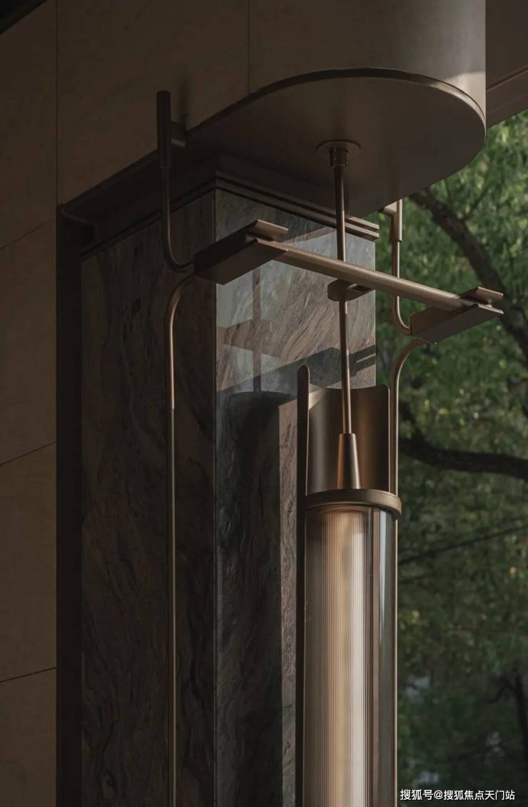 社区入口设计以“隐奢”为核心理念,摒弃传统豪宅项目的张扬符号,转而通过材质、比例与空间叙事的精准把控,传递低调中的精致感。主入口并未采用高耸的门楼或繁复的装饰,而是以米黄色石材与香槟金色金属格栅的组合,构建出克制而优雅的视觉语言。