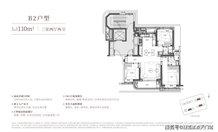 建面约110㎡边套(B1户型),1个宽面阳台、5个飘窗,整体南向面宽做到了约12.3米,大横厅面宽约5.4米,带来超大空间体验和充足通风采光。更为难得的是,该户型标配了全屋飘窗,主卧更是拥有270°转角飘窗,拓宽室内景观视野的同时,增加了实际空间使用率,加上三玻两腔系统窗隔音,在欣赏窗外景色的同时,也不会被噪音打扰。建面约110㎡中间套(B2户型),也同样做到了南北通透,三开间朝南,洄游动线,布局合理,无论是空间尺度还是通风采光,与边套享受一样的品质感!