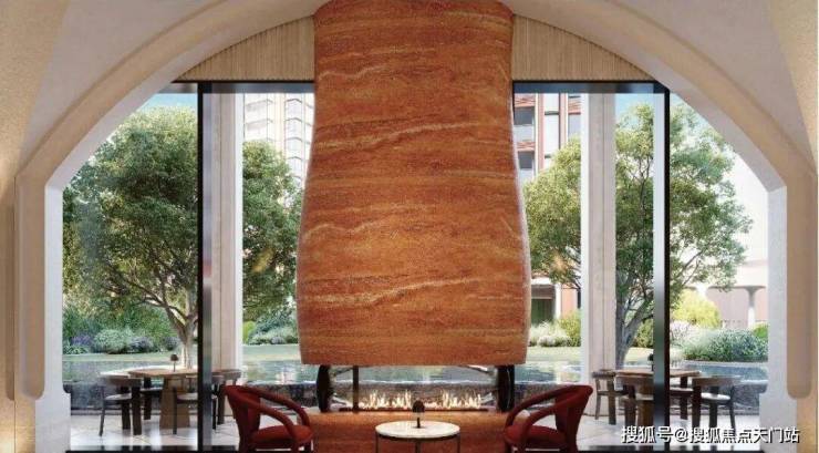 大堂位于主入口。米白色调为主,中辅以温暖红橘色调,拱形吊顶、铁艺花门和拼贴机理大理石地面交织复古与现代。枝形吊灯散发出艺术光芒,红洞石装置与室外红砖立面遥相呼应。复古橘色非围合沙发洋溢着温情,四向座席无主次之分望向室内或花园,四向皆景。