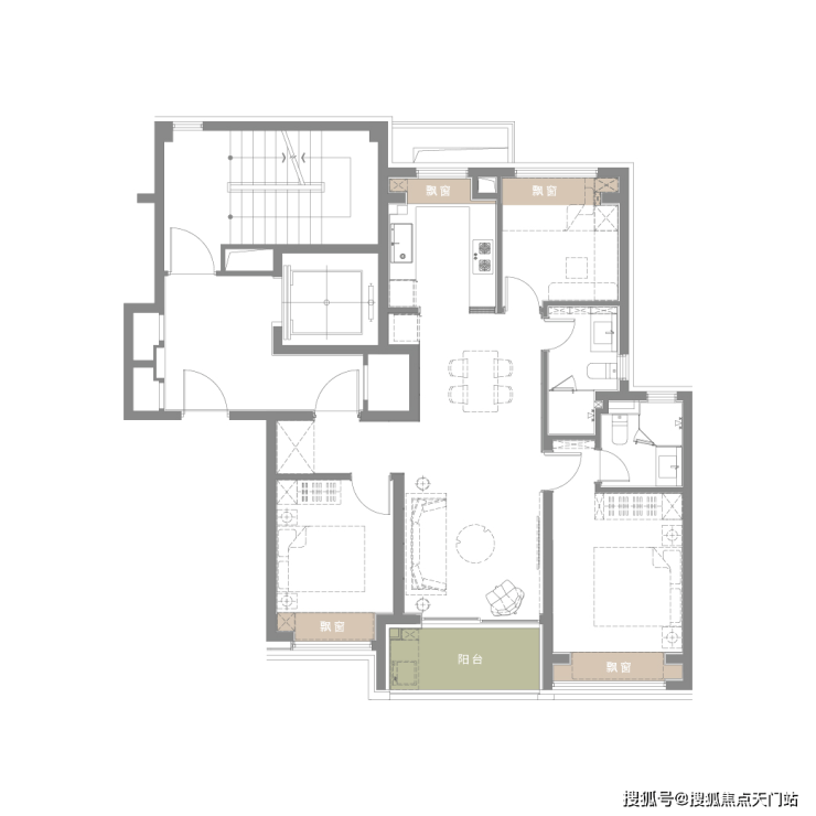 主卧:270度无柱转角飘窗
