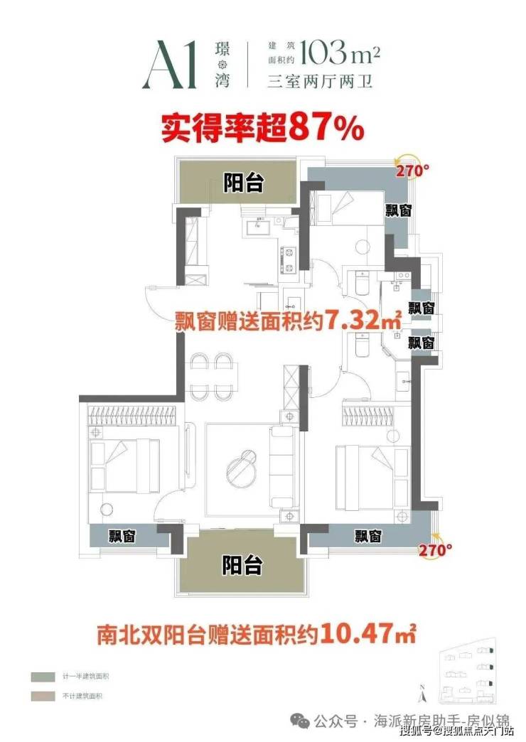 建面约103㎡A1户型,约10.47㎡南北双阳台空间,阳台“买1赠1”,赠送约5㎡,南侧观景阳台,北侧功能阳台,更附赠约7.32㎡飘窗,实得率超87%。