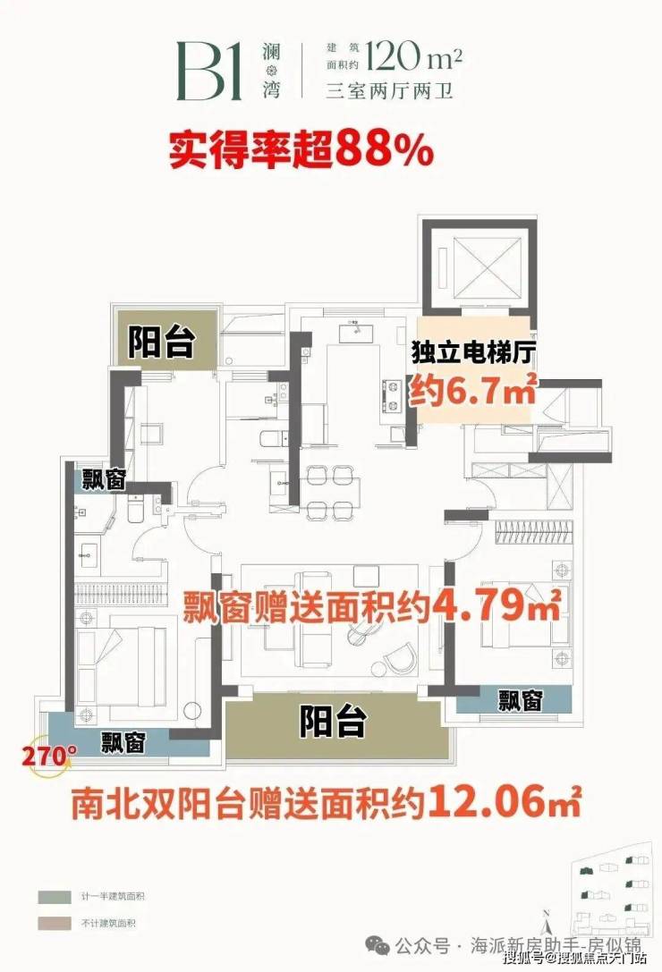建面120㎡B1户型,约12㎡南北双阳台空间,阳台“买1赠1”,赠送约6㎡,次卧拓展后都有舒适尺度,更附赠约4.79㎡飘窗,实得率超88%。