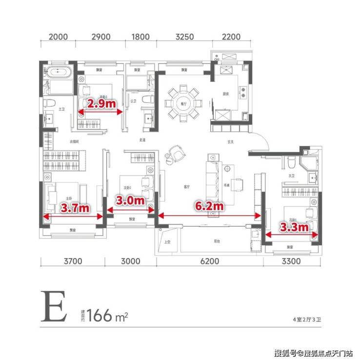 次房间宽也达3.3米;两个小房间开间也有3米和2.9米,都能放大床。