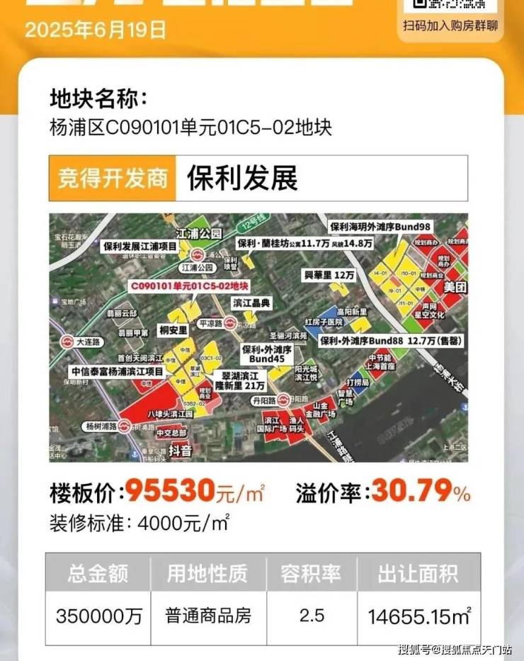 今年5月, 杨浦区N090602单元L4-0 2地块出让,出让结果:以 总价424063万元成交, 溢价率约26.3%、楼面价80199元/㎡。