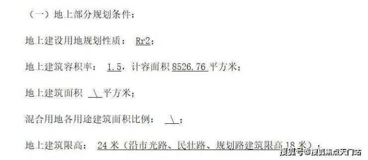 根据出让内容,该地块建筑面积只有约8526.76㎡,容积率为1.5,地上建筑限高为24米,其中沿市光路、民壮路、规划路建筑限高18米。
