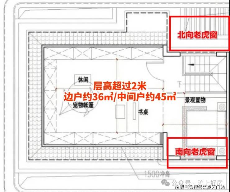 ⑥、项目的所有上叠产品,都规划了层高超过2米的灵动空间 (因屋顶造型因素,边户约36㎡,中间户约45㎡)。