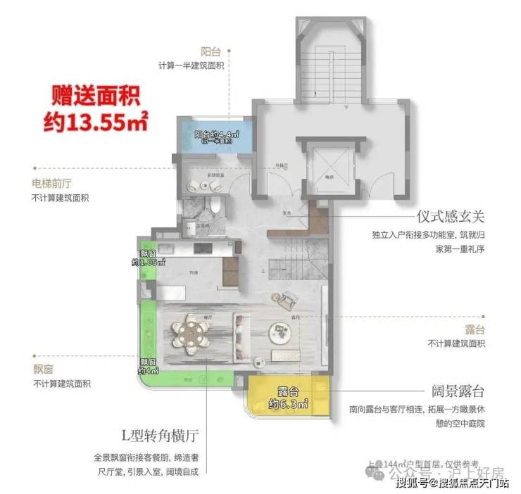 在细节打磨上,此户型亦不遗余力。 全屋飘窗全赠送约9.8㎡,配合约7.2㎡的大阳台(计一半建筑面积) 不仅增加了实际使用面积,更在视觉上提升了空间的通透感。