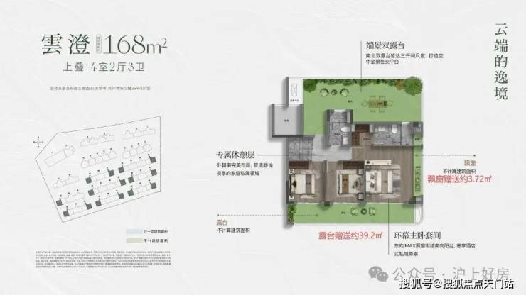 建面约144㎡的上叠产品,通过巧妙的 挑 空、 总计约 15㎡露台 及灵动空间设计,让户型的实际可使用面积高达约180 ㎡,实得率约125%。