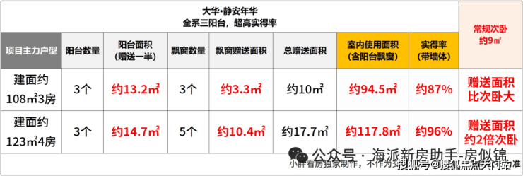 建面约108㎡3房,三阳台面积达约13㎡(赠送一半),飘窗赠送约3.3㎡,室内使用面积达约94.5㎡,实得率高达约87%,总赠送面积比常规次卧都大。