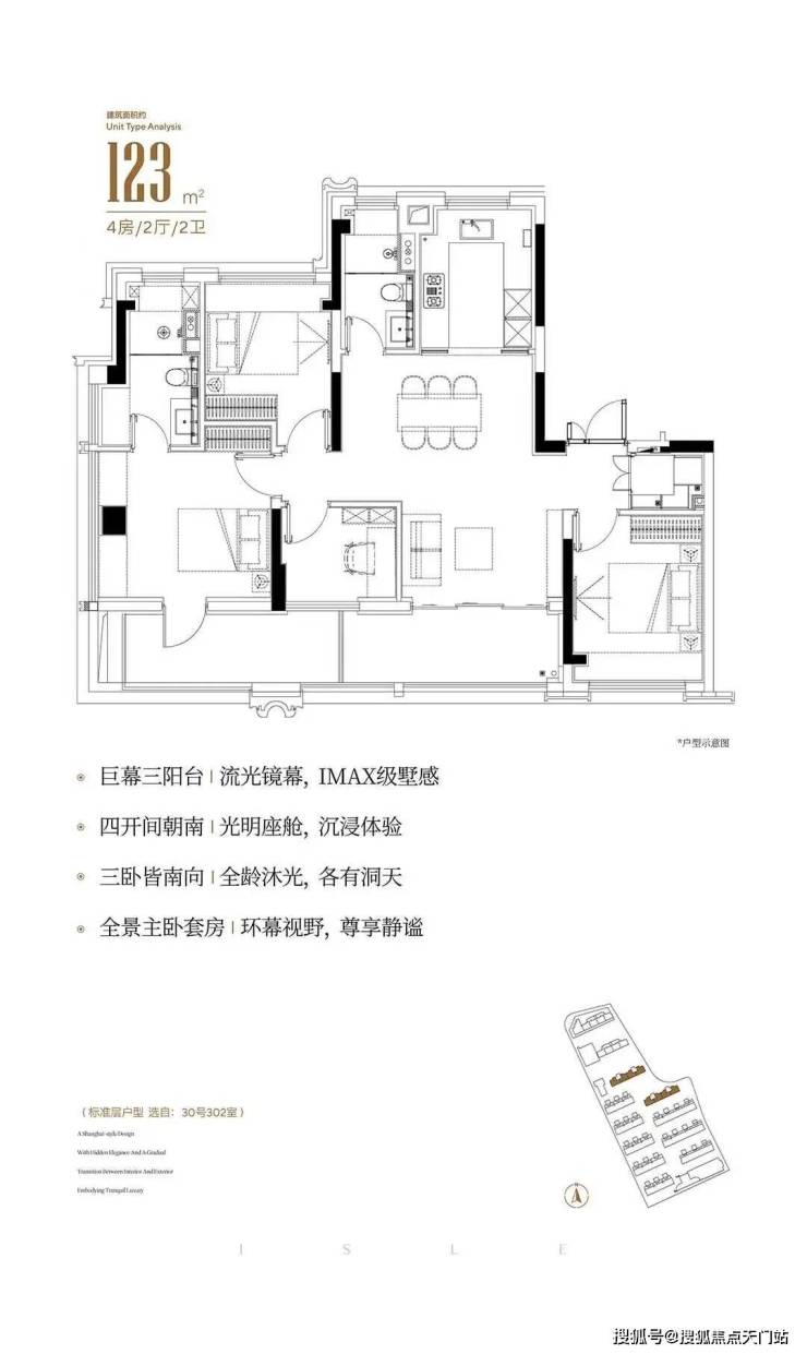 123平4房2卫,采用类一梯一户设计,非常少见的4开间朝南+4房南北通透户型。