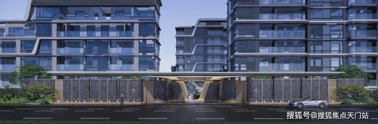小区归家大门约100米的超级界面,选用45米的宽奢石铺装门头串联起流转水景,蓝翡翠镜面奢石,搭配范思哲黑定制水景,更显尊崇。