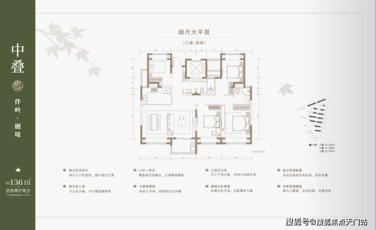 建面约137㎡下叠, 四房两厅三卫 全能格局,非常适合二娃家庭以及三代同堂。