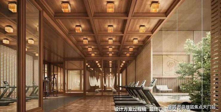 瑜伽健身区,大幅落地窗引入自然光线,天花的格栅造型,地面的复古拼花木地板,都透出浓厚的海派风情。