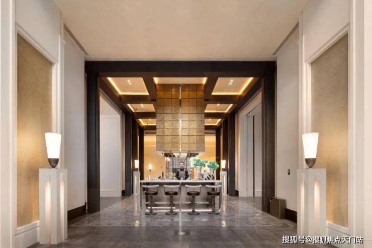 艺术大厅净高约 6.5 米,面积约 210 平,视野开阔,墙面甄选天然石材搭配木质艺术屏风和艺术墙布,地面天然石材拼花精美,艺术优雅。
