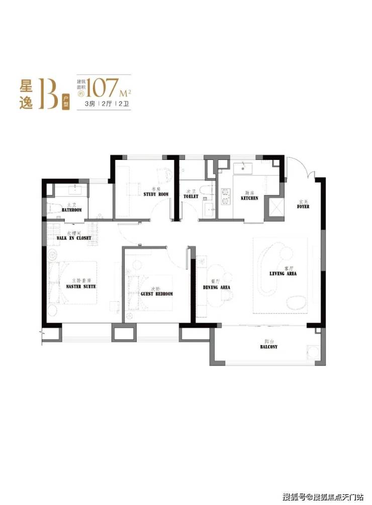 项目约103-107㎡3房2卫设计,有着 宽绰的大横厅设计,并且3.5开间朝南。