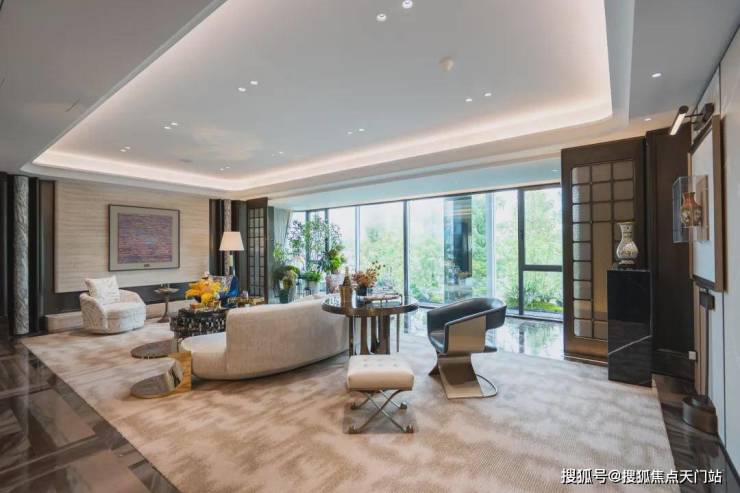 例如入户玄关铺设有“石材皇后”鱼肚印象,这种级别的奢石在很多顶豪项目中通常仅作局部镶嵌