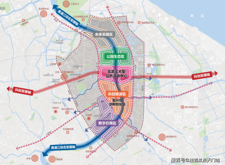 黄浦滨江中北部最新规划“一心”为两轴交汇处形成北滨江公共活动中心。“四区”为以复兴岛为核心,联动两岸形成科创策源区;南部滨江数字引领区提升在线经济产业能级; 中北部公园生态区强化生态辐射效应;北部片区为未来发展区。