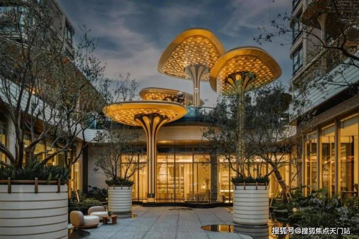 森之庭院:项目西面和南面有2条自然水系环绕,将项目围合形成环岛式社区。为了把设计灵感还原于项目,设计师在中央景观区设置了6重飞流星瀑布(高度在4.5m至12m不等),水流潺潺而下,宛如 “水木鎏金” 空中华庭,视觉感官拉满。立柱以大树为母体,象征着生命之树,是自然与艺术结合,将郊野公园森系意境融为一体。