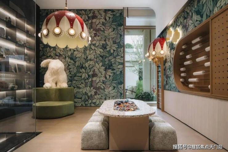 气泡花园:以 “气泡” 为灵感,取莫奈画作色系,将气泡绽裂瞬间定格于水院。以库班绿奢石为地面基底,水纹肌理搭配精工裁切,高端材质与艺术设计,臻贵奢享。