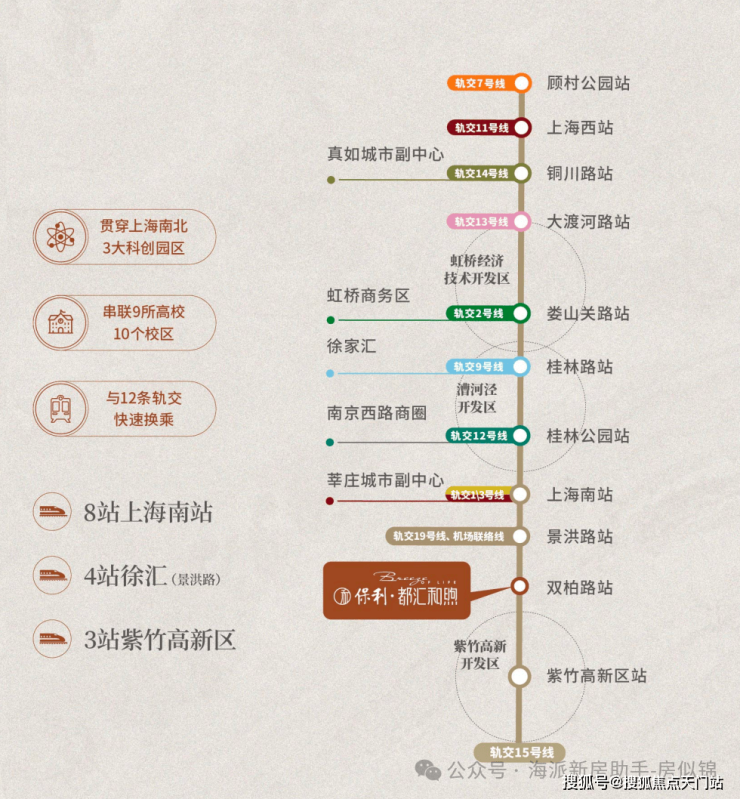 15号线双柏路站距项目直线距离约650米(数据来源于百度地图测绘),约20公里万亿产业带,贯穿上海南北3大科创园区,串联9所高校10个校区,与11条轨交快速换乘。