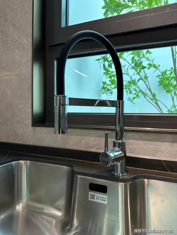 水槽也是一个 大单槽,放得下炒锅汤锅这种大物件~ 抽拉式龙头,清洗大水槽的时候很方便,360度旋转伸展自如,这款弯管还是 硅胶材质,柔软耐用有弹性,还可切换出水模式,出来的水柱也是很柔和细腻不飞溅。