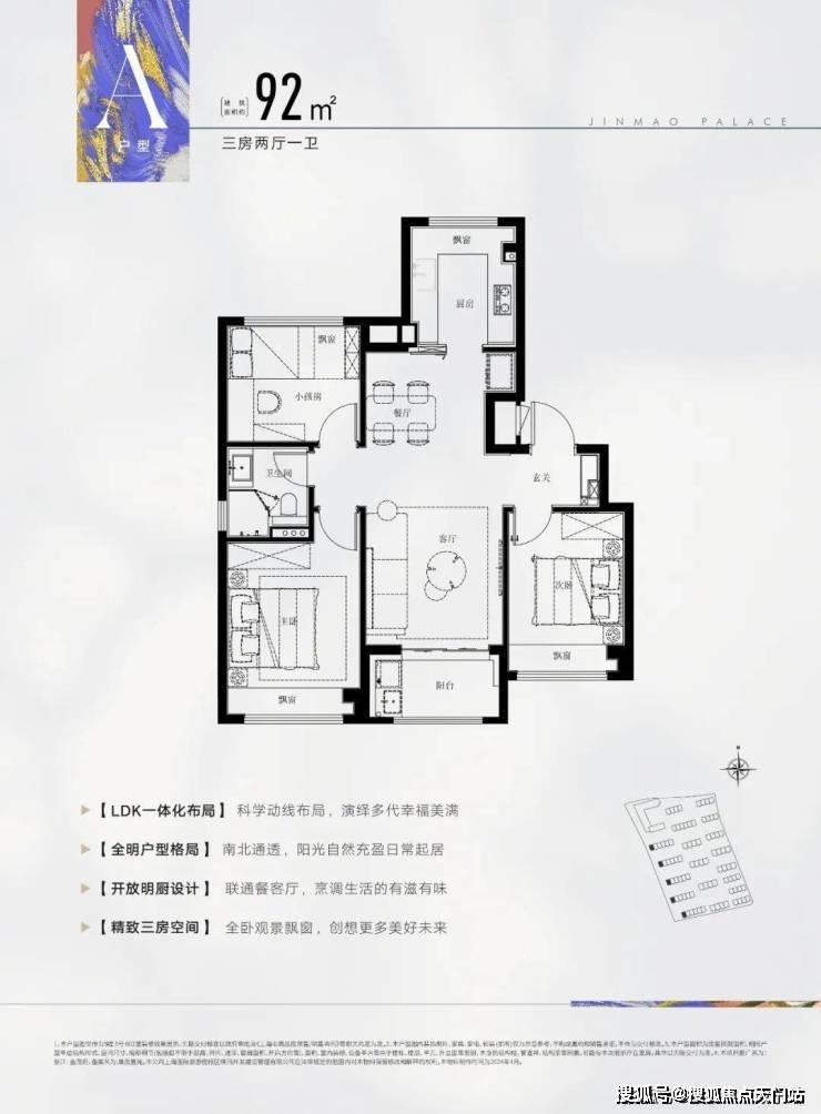 项目主推建面约92-138㎡3-4房,主力户型包括建面约92㎡3房2厅1卫,约100㎡3房2厅2卫,约138㎡4房2厅2卫。