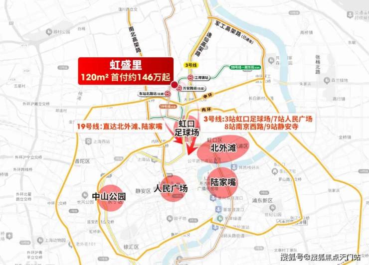 三轨交环绕形成高效通勤网—— 直线距离3号线江湾镇站约500米 ,3站虹口足球场/7站人民广场/8站南京西路/9站静安寺; 直线距离20号线万安路站约150米(在建)/直线距离南北大动脉19号线车站南路站约900米(在建) ,未来可直达北外滩、陆家嘴。