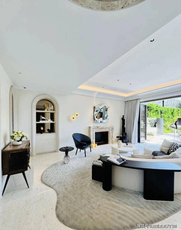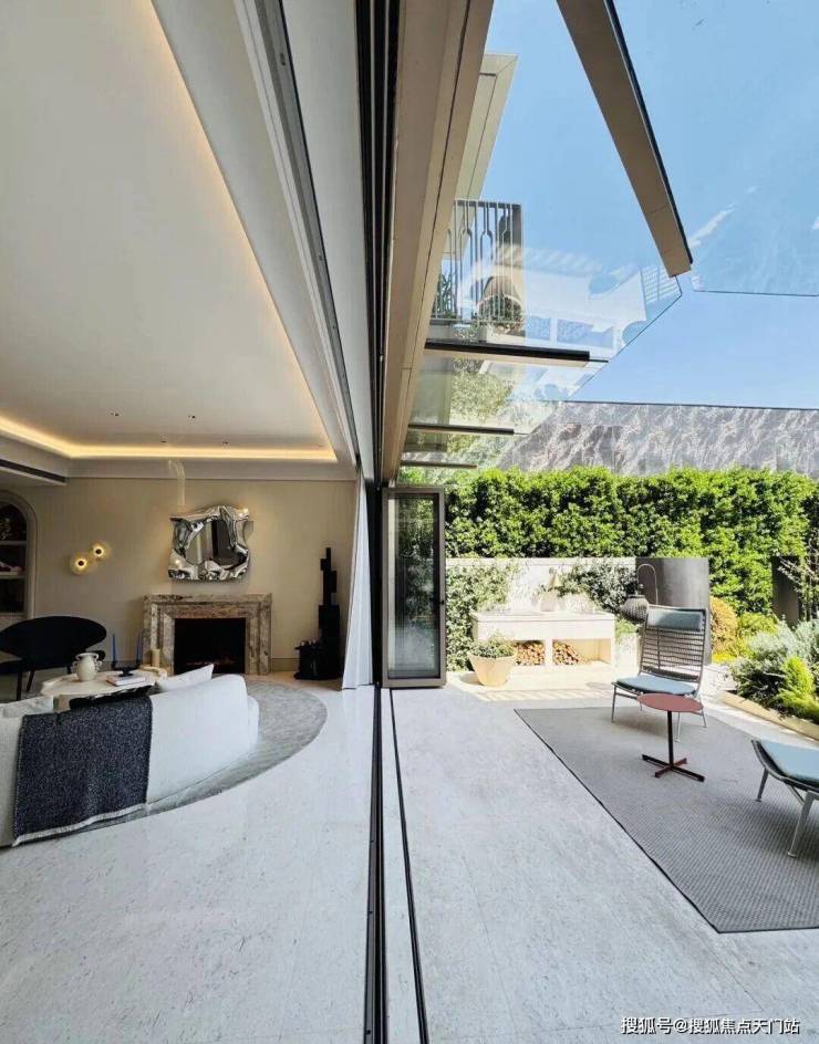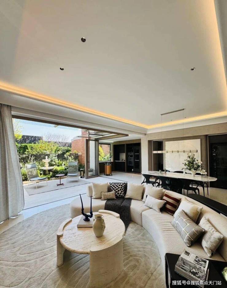 「无界空间」:客厅270度转角无柱设计,搭配落地玻璃,开阔视野将院中风景迎入日常。