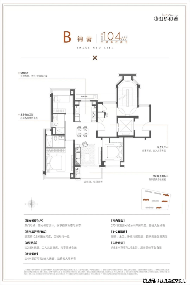 建面约104㎡3房,在建面94㎡小3房优点上,又进一步升级了尺度感, 约10.3m的南向面宽,为室内带来了出众的采光面和尺度感,这个户型无论从实用性、尺度感,亦或是视野、采光、私密性来说,都做得相当优秀。