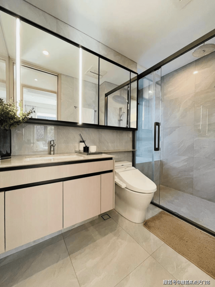 卫生间采用了TOTO智能马桶(卫洗丽)、toto台盆、高仪龙头花洒,松下暖风机,摩恩小五金,镜柜组合。