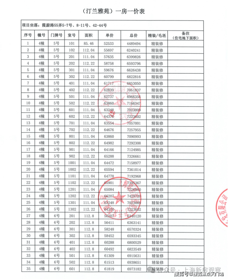 上期一房一价表如下: