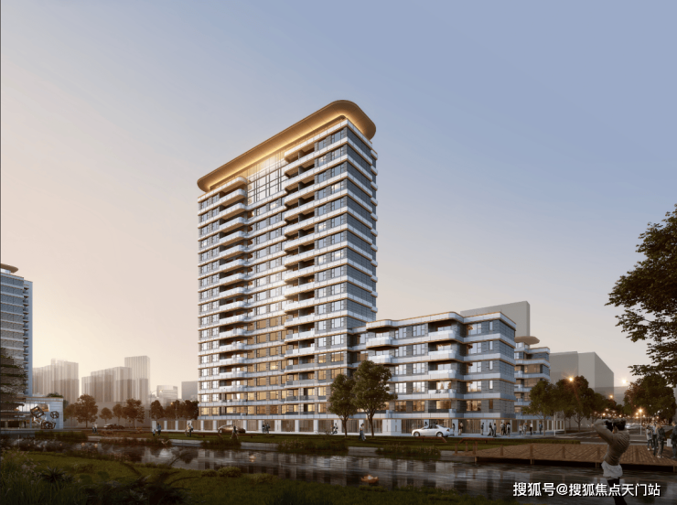 建筑布局随河蜿蜒,高低错落的建筑形态也契合了江南水乡的水韵特色,加之建筑顶部的金冠起伏,与景观河交相辉映,串联成金色丝带东西贯通,更是凸显了本项目的高标准、高品质的居住体验。