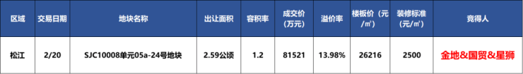 今年2月,上海2025一批次土拍中,国贸、金地、星狮联合体以8.1521亿元竞得松江SJC10008单元05a-24号地块,溢价率13.98%,成交楼面价26216元/m²,装修标准不小于2500元/㎡。