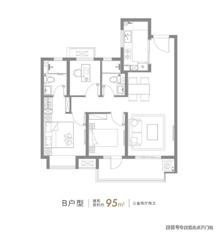 约95㎡的3房2厅2卫户型,这个户型的实用性太高了。能保证业主从二人世界到二胎家庭的全生命周期需求。