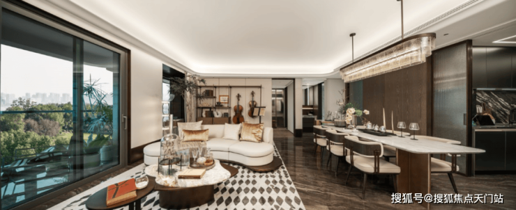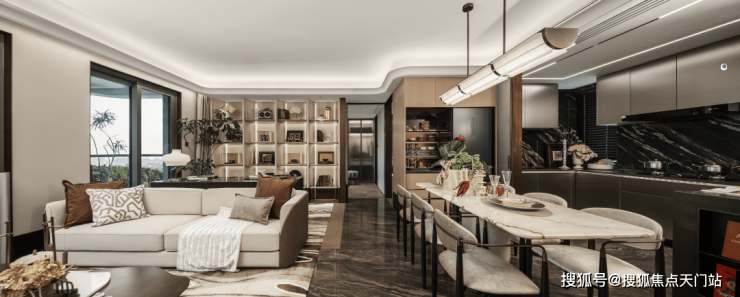 或者将项目的南向次卧和客厅连通成一个超大面宽的横厅,尺度阔绰,媲美市面上豪宅项目的面宽。
