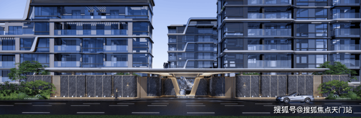 小区归家大门约100米的超级界面,选用45米的宽奢石铺装门头串联起流转水景,蓝翡翠镜面奢石,搭配范思哲黑定制水景,更显尊崇。