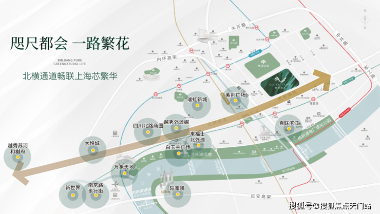 自驾的话,浦西北四区的“烫金主干道”北横通道的入口距离项目只有约350米,距离内环高架也很近。最快约13分钟抵达陆家嘴,约20分钟人民广场,隆昌路隧道(规划)开通后,约15分钟可达张江科学城!